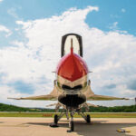 The Thunderbirds showcase U.S. fighter pilot elite skills and demonstrate the capabilities of the Air Force’s main multirole fighter jet, the F-16 Fighting Falcon. The navy blue outline of a bird of prey can be seen when viewing the plane directly from above or underneath.