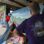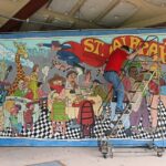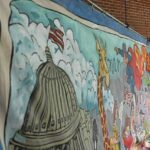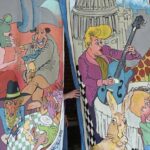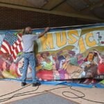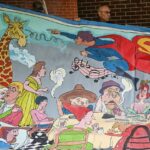 That backdrop took two months to complete in 2009 and 2010. On a black-and-white checkered floor, there’s a vibrant array of people playing instruments, sitting at tables and dancing. The people are joined in their merriment by animals — an elephant, a giraffe and others.