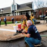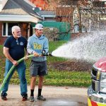 The students worked the fire department’s hoses and hooked up to a hydrant in order to spray the trucks and rafts. They also soaped up and scrubbed the sides of the truck.