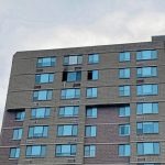 Yellow caution tape remained up at part of the building Friday morning. Windows were broken out of a unit on the 11th floor, and the exterior had signs of smoke damage.