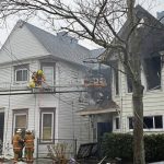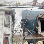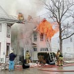 Firefighters worked for a couple hours as flames kept appearing in the charred remnants of the home where the fire began. Two ladders were aimed at the roof and second floor from trucks parked on Harrison Avenue.