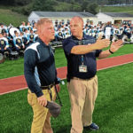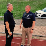 As players go through pre-game drills, Rapp confers with Jeff Pritt, Norwin’s school police officer and a retired Greensburg officer.