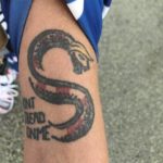 She has a tattoo with the famous American Revolution flag of a rattlesnake next to the slogan of “Don’t Tread on Me.” In a twist, the head of the rattlesnake is a portrait of Trump, complete with his blonde hair.