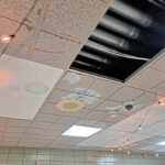 During that inspection, water-stained and missing ceiling tiles were noticed in all three areas. Plastic sheeting was hung underneath any missing tiles, and drain tubes were installed to direct leaking water into buckets.