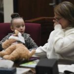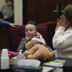 When it came time to pose for a family photo in the courtroom, the youngest member perched high on the arm of her oldest brother, flailing her arms out and repeating “cheeseburger.”