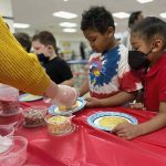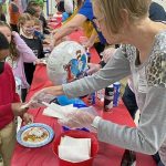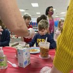 Community members and school board directors helped by passing out plates and pancakes and topping them with sprinkles, syrup, whipped cream and candy corn. Gansor said the pancakes and toppings were supplied by Eat ‘n Park. Independence Excavating Inc. gave each student a book.