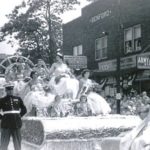 Still images from the parade show the centennial queen and her court riding a float past Latrobe’s Army & Navy Store and a drum and bugle corps marching in front of the Woolworth store and the news stand.