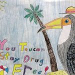 Aubrey Wadsworth’s winning entry in the 24th annual calendar contest illustrates the month of July. In a play on words, her slogan, “You Toucan Stay Drug-Free!” appears alongside her rendering of one of the colorfully billed birds, sunning next to a palm tree on a tropical shore.