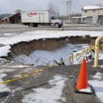 Pavement around the hole appears to be cracking. It is blocked off by orange cones and caution tape. Business there has not been affected.