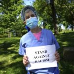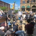 Neurologist Dr. Marti Haykin said she came to the protest after her shift at Excela Westmoreland Hospital to stand “in solidarity with everyone who’s against police brutality.” She held a “stand against racism” sign while gathering with the crowd.