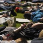 The march began about 3 p.m. After marching about two blocks to the park, protesters went face down with their hands behind their backs chanting “I can’t breathe” for nine minutes — about the same length of time Minneapolis police officer Derek Chauvin kept his knee on Floyd’s neck.