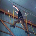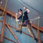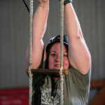 Kristin Dinkel, a first grade teacher at Greensburg Salem’s Nicely Elementary School, jumped from atop a platform 30 feet above the floor of a tall outbuilding, launched herself across a 5-foot gap and used both hands to grab hold of a bar suspended in midair.