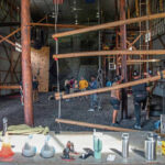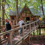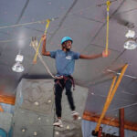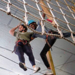 That didn’t stop her from teaming with High School Co-Principal Adam Jones to complete part of a “high ropes” course. After climbing again to 30 feet and strapping in to safety harnesses, they advanced together— step by careful step — across a type of rope bridge with wooden footholds each spaced a few feet apart.