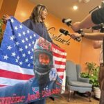 After the volume inside the restaurant dropped below a roar, Christine Graves, Jones’ mother, unfurled an enormous U.S. flag bearing a triumphant image of Jones.