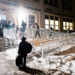 Later, as temperatures plunged to 7 degrees, a woman joined the queue. Her boots were the same tint of weather-worn brown as her winter coat. She wore three or four layers of clothing; a red hooded sweatshirt and black outerwear vest peeked out above her coat collar. In a backpack, she carried a stuffed pink unicorn accented with splotches of fluorescent green.