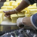 Boxes of food — fish, french fries and ingredients for coleslaw and halushki — are unloaded from packed delivery trucks on Saturdays. Volunteers come in on Sundays, Mondays and Tuesdays to rotate the fish and help it thaw. More than 20 roasters are used to cook the halushki on Wednesdays, and tartar sauce is prepared on Thursdays.