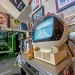 The gallery’s white walls are barely visible underneath hundreds of paintings, photographs, posters and stickers. Green LED string lights silently pay tribute to the gallery’s name, and various eclectic decorations surround the stage — including a 1970s television shaped like an astronaut’s helmet.