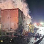 The first tractor-trailer burst into flames. That driver and Oliver were taken to a hospital. The other two tractor-trailer drivers either weren’t hurt or were treated at the scene.