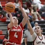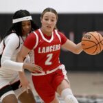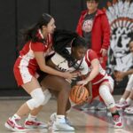 Neshannock’s Sophia Bonner drives past Aliquippa’s Jakhia Arnold during their game on Wednesday at Aliquippa. (Christopher Horner | TribLive)