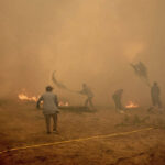Residents battle a fire advancing toward Rebordondo village, near Ourense, in northwestern Spain, on Monday.