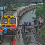 Commuters walk on waterlogged railway tracks after trains were disrupted due to heavy rainfall in Mumbai, India, Tuesday.