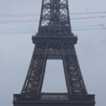 Jets of the acrobatic Patrouille de France patrol fly by the Eiffel Tower, Wednesday in Paris.