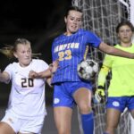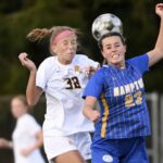 Hampton’s Harper Gibbons battles Mars’ Katie Blake for possession during their game on Wednesday at Fridley Field in Hampton.