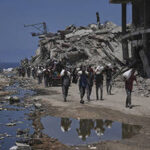 Palestinians carry sacks of flour unloaded from a humanitarian aid convoy that reached Gaza City from the northern Gaza Strip, Tuesday, July 22, 2025. (AP Photo/Jehad Alshrafi)