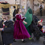 Ultra-Orthodox Jewish kids wear costumes ahead of the Jewish holiday of Purim in Jerusalem, Wednesday.