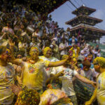 Nepalese people throw colors on each other as they celebrate Holi, the Hindu festival of colors at Basantapur Durbar Square in Kathmandu, Nepal, Thursday.