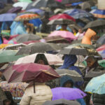 Participants in a mass for the jubilar pilgrims from Naples wait for the start of the celebration under pouring rain in St. Peter’s Square at The Vatican, Saturday.