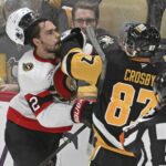 The Penguins’ Sidney Crosby gets a left hook in on the Senators’ Artem Zub in the third period on Sunday at PPG Paints Arena.