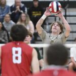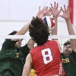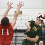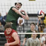 Penn-Trafford’s Owen Gisi spikes against Peters’ Alex Klein during first-round 3A WPIAL Volleyball playoff action Tuesday at Penn Trafford High School.