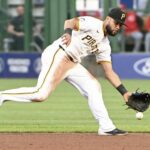 Latrobe’s Jack Stynchula can’t handle a throw as Pine Richland’s Anthony Mengine gets to third during 5A WPIAL baseball playoff quarterfinal action Monday at Plum High School.