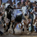 Members of a team shout and push a pair of bulls to start running during a traditional bull race competition, in Malal, a village of Attock district, in Pakistan, Thursday.