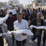 Palestinians carry the bodies of their relatives, including children, who were killed in an Israeli army airstrike in Deir al-Balah, Gaza, Wednesday.