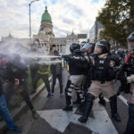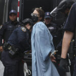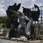 Municipal workers remove the cover that protected a monument of Kyiv legendary founders from Russian missile attacks on the fourth year of Russia-Ukraine war on the country’s main square in Kyiv, Ukraine, Wednesday.