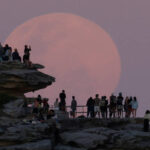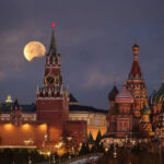 The Beaver Moon, a type of supermoon, sets behind the Kremlin and St. Basil’s Cathedral in Moscow, Russia, on Wednesday.
