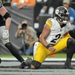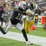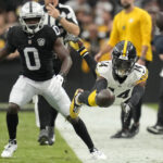 Steelers wide receiver George Pickens dives forward after catching a pass in front of Las Vegas Raiders cornerback Jakorian Bennett on Sunday during the first half of an NFL football game in Las Vegas.