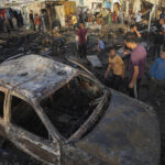 Palestinians look at the damage after an Israeli strike hit a tent area in the courtyard of Al Aqsa Martyrs hospital on Monday in Deir al Balah, Gaza Strip.