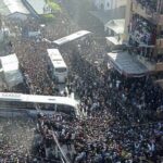 A drone view shows people gathering at Nasser hospital as they welcome freed Palestinian prisoners released by Israel as part of a hostages-prisoners swap and a ceasefire deal between Hamas and Israel, in Khan Younis in the southern Gaza Strip, October 13, 2025. REUTERS/Stringer TPX IMAGES OF THE DAY