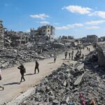 Palestinians walk past the rubble of destroyed buildings, amid a ceasefire between Israel and Hamas, in Gaza City, October 14, 2025. REUTERS/Ebrahim Hajjaj TPX IMAGES OF THE DAY