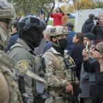People use their phones to record as they argue with federal agents at an intersection in the Cicero neighborhood during an immigration raid, after U.S. President Donald Trump ordered increased federal law enforcement presence to assist in crime prevention, in Chicago, Illinois, on Wednesday.