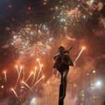A girl performs mallakhamb, a traditional Indian sport, as fireworks illuminate the sky during Diwali, the Hindu festival of lights, in Mumbai, India, on Wednesday.