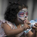 A child with a painted face looks on as revellers gather to witness the annual Catrinas Day parade, ahead of the Day of the Dead, in Mexico City, Mexico, on Sunday.
