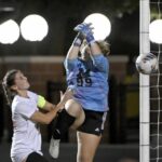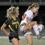 Moon’s Riley Lafayette works against Montour’s Kira Hobbs during their game on Wednesday, Sept. 17, in Robinson.