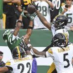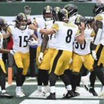 Steelers quarterback Aaron Rodgers and the offense celebrate with Ben Skorwronek after Skorwronek’s touchdown against the Jets in the first quarter Sunday at MetLife Stadium.