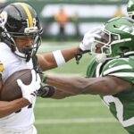 Steelers receiver Calvin Austin III stiff-arms the Jets’ Tony Adams in the second quarter Sunday at MetLife Stadium.