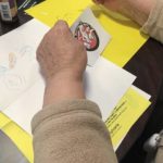A resident peels off a “Kick Butts Day” sticker to add to her creation, a colorful image of an adult exhaling smoke while a nearby child coughs.