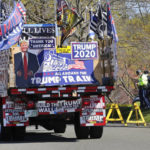 At least two trucks with banners reading “Trump Keep America Great 2020,” “All Lives Matter,” “Build the Wall,” and “Make Liberals Cry Again” also drove by to cheers from protesters.